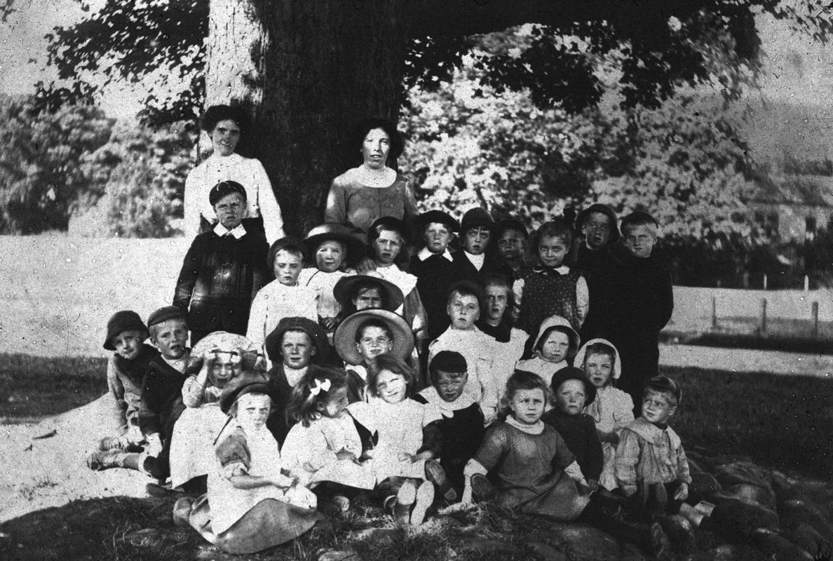 Another class, with some lovely sun hats on show. They are under the plane tree on the green, with Crakehall House in the background. Date unknown, but probably pre-WW1.
